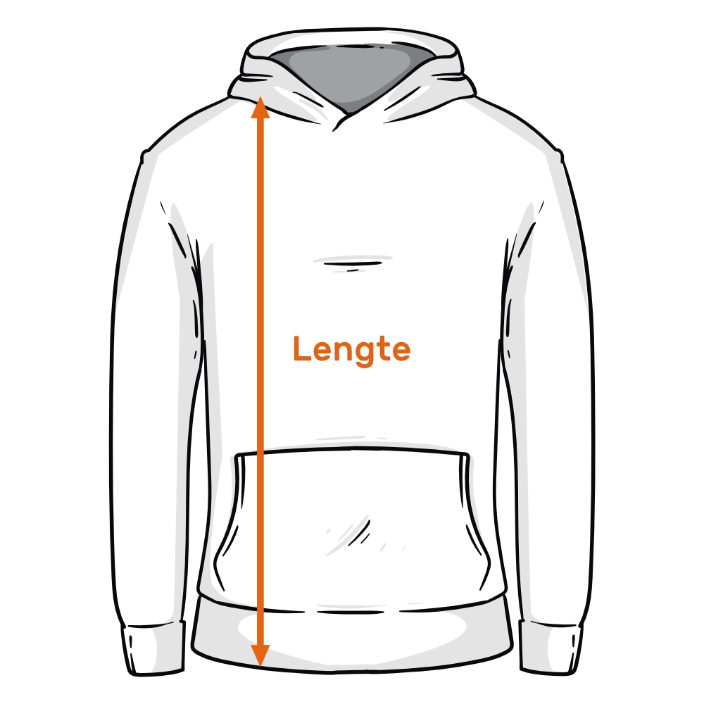 Meet de lengte van de bovenkant van de trui naar de onderkant, precies zoals aangegeven door de oranje lijn.